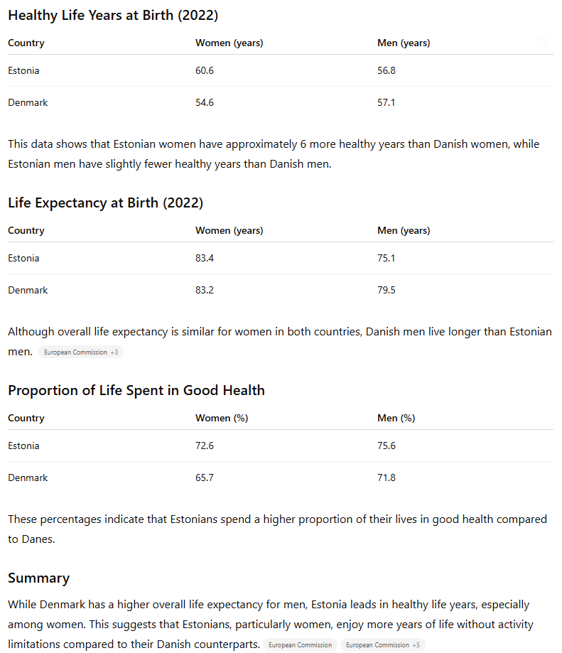 Väga üllatav info minu jaoks. Eriti taani naiste ülimadal tervena elatud aastate arv. Intuitiivselt oletasin vastupidist. Sel juhul tuleb tunnistada, et see argument Taani/Eesti pensioniea erinevuse osas langeb ära.