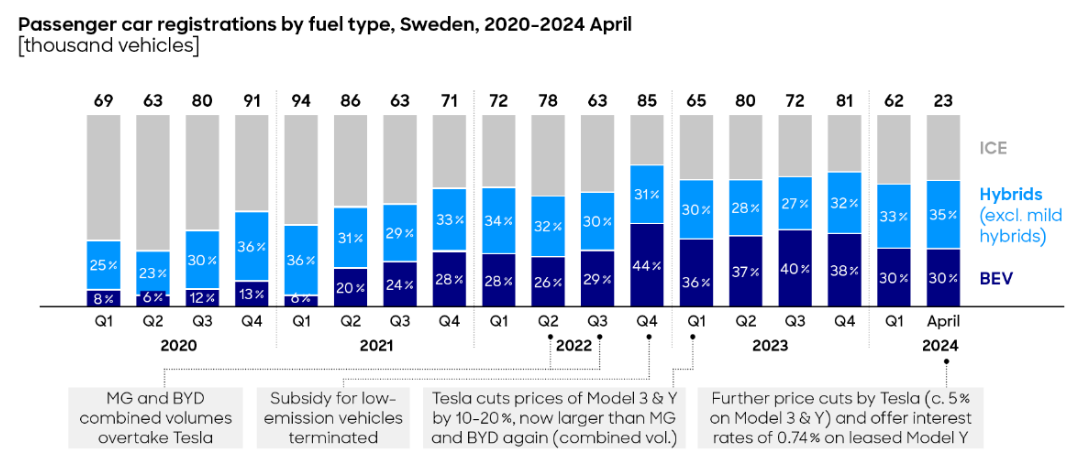 Pilt siin jutuks olnud Rootsist - 2021 alates on EV turg täis, EV müügi osakaal kõigub samas väikeses vahemikus.