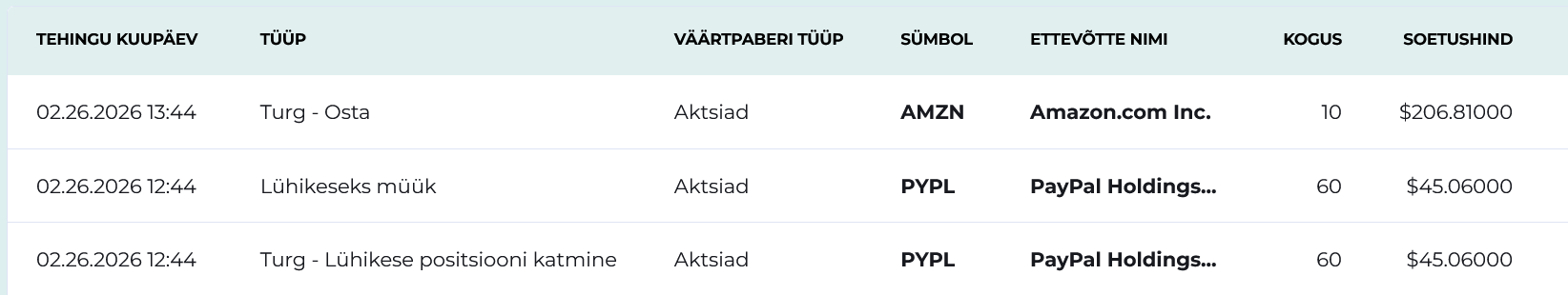 Lühikeseks müügi puhul näitab nii positsiooni võtmisel kui selle katmisel katmise hinda. Antud juhul ma võtsin selle PYPL lühikese positsiooni kuskilt 47,38 dollari pealt päev varem mitte täna ja sain ka kasumit. Tehingute Ajalugu on siis see koht, kus niimoodi tehinguid valesti näitab. Kusjuures “Suletud positsioonid” all näitab korrektselt mõlema tehingu hinda ja ka kasumit. Seal on muidugi väga kummaline see, et miks ma ise pean aktsiaid ühekaupa valima rippmenüüst, kui tahaks pigem kõiki suletud positsioone korraga tabelina kuvada. Mitut aktsiat korraga valida ei lase.
