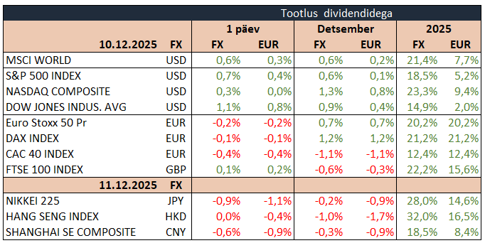 Aasia aktsiaturud liikusid öösel allapoole: Nikkei langes 0,9%, Shangai Composite 0,7%, Kospi 0,6% ja Hang Seng 0,1%. ASX200 kerkis 0,2%, kui kaevandussektori tugevus kompenseeris tehnoloogiasektori nõrkuse. Brenti toornafta odavnes 0,6% 61,9 dollarile, Bitcoin langes 2,7% 90 259 dollarile ning Ethereum kukkus 3,7%, kaubeldes 3200 dollaril. EUR/USD tugevnes 0,1% 1,1696 dollarile ja unts kulda maksis 4215 dollarit (+0,4%).