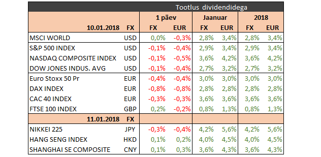 Esimest korda sel aastal pidi Ühendriikides S&P 500 vastu võtma kaotuse, leppides siiski vaid -0,1% madalamal. Järsem tõus võlakirjade tulusustes tingis jõulisema müügi just intressimäärade suhtes tundlikumates kinnisvara- ja kommunaalteenuste ettevõtete aktsiates. Euroopa aktsiaturud lõpetasid erisuunaliste liikumistega (Stoxx 600 -0,4%), kui üheks võimalikuks surve allikaks võis olla EUR/USD-i päevasisene hüpe 1,1940 pealt 1,2018 dollarile.