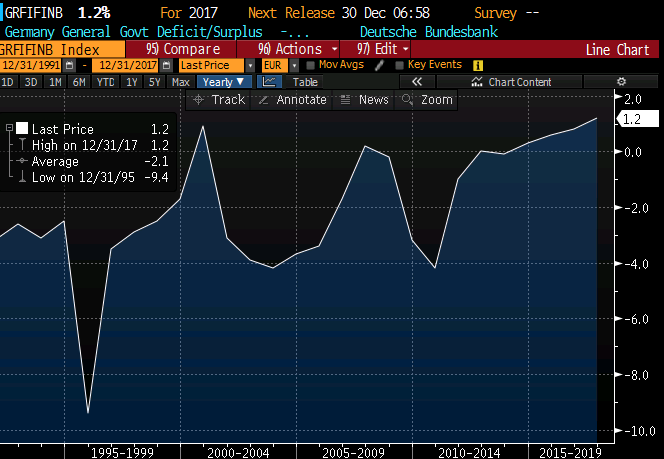 GERMAN BUDGET SURPLUS WIDENS TO RECORD 1.2% OF GDP IN 2017