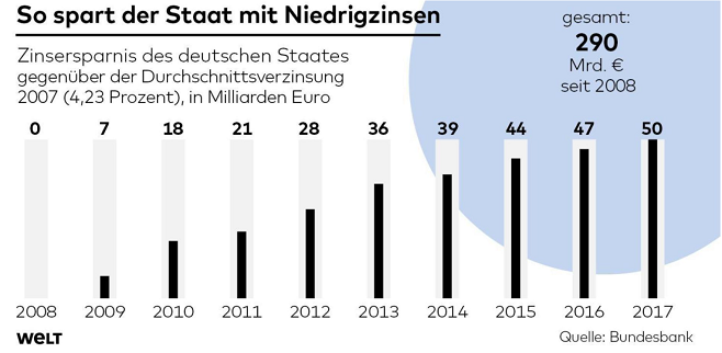 Graafik Welti lehelt, kus on välja toodud, et tänu Euroopa Keskpanga madalatele intressimääradele ja QE-le on Saksamaa valitsus alates 2008.aastast võlakirjade intressimaksete pealt kokku hoidnud 290mld EUR