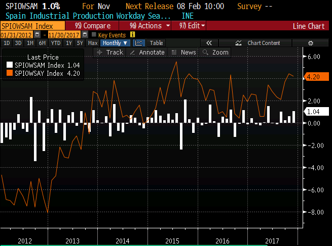 Hispaania tööstustoodang kasvas novembris MoM 1,0% vs oodatud 0,2%, mullusega võrreldes oli tempo 4,2% vs oodatud 3,3%