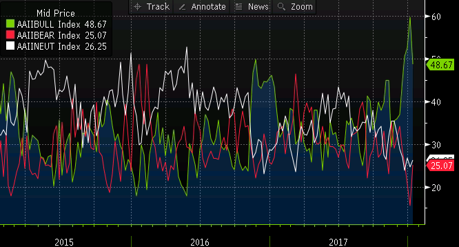 Nädalaga on aset leidnud väike leevendus USA väikeinvestorite optimsmis, kui aktsiate suhtes järgmise kuue kuu perspektiivis optimisliku nägemusega investorite osakaal alanes 59,8% pealt 48,7%le ning karude osakaal kerkis 15,6% pealt 25,1%le. Neutraalse hoiakuga investorite osakaal tõusis 24,7%lt 26,3%le