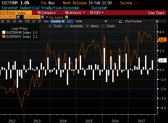 Eurotsooni tööstustoodang kasvas novembris MoM 1,0% vs oodatud 0,8%, mis jättis aastase kasvu 3,2%le (oodati 3,1%).