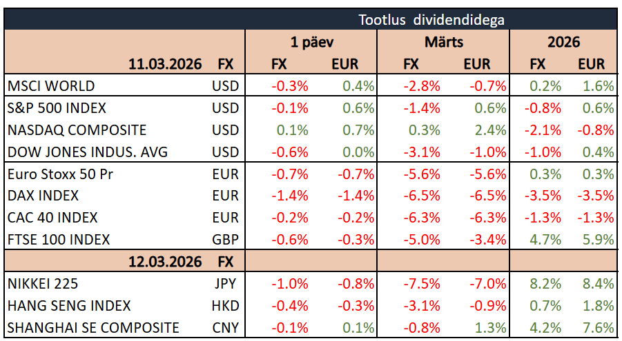 USA aktsiaturud lõpetasid kolmapäeva languses, kui Pärsia lahe konflikt kergitas naftahindu ja süvendas inflatsioonihirme. S&P 500 taandus 0,2%, Nasdaq 100 0,1% ning Dow Jones 0,7%. Brenti toornafta hind tõusis eile üle 90 dollari barreli kohta pärast rünnakuid kaubalaevadele Hormuzi väina lähistel, mis varjutasid Rahvusvahelise Energiaagentuuri rekordilise, 400 miljoni barreli suuruse strateegiliste reservide vabastamise teate. Geopoliitilised pinged hoidsid turud ettevaatlikuna ning survestasid nii aktsiaid kui ka võlakirju.