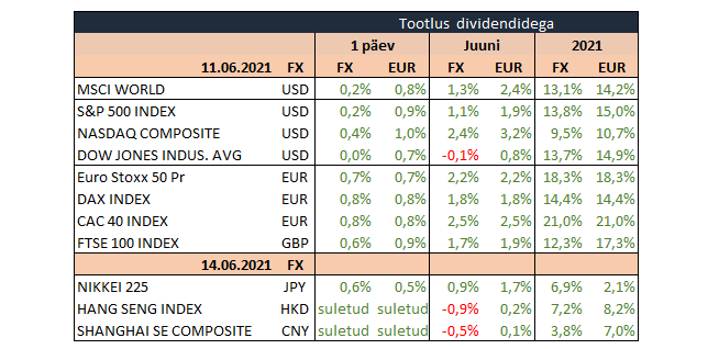 Ühendriikide aktsiaturud liikusid terve reedese päeva marginaalsete muutustega, kuid tänu ostuhuvile sessiooni lõpus õnnestus S&P 500 indeksil kirja saada 0,2% ja Nasdaqil 0,4% tõus. Nädala peale kogunes neil indeksitel tootlust vastavalt 0,4% ja 1,9%. Euroopas sulgus Stoxx 600 reedel 0,7% kõrgemal, mis kergitas nädala peale tõusu 1,1%ni.