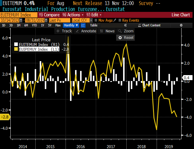 Euroala tööstustoodang kasvas augustis 0,4% võrreldes juuliga, osutudes pisut paremaks oodatud 0,3%st. Mullusega võrreldes kiirenes langus -2,8%ni.