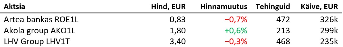 Aasia aktsiaturgudel vähendati öösel riske: Hang Seng langes 1,9%, Shangai Composite 0,7%, Kospi 0,4%, Nikkei 2,7%, kuid ASX200 kerkis 0,2%. Brenti toornafta odavnes 0,4% 63,0 dollarile, Bitcoin langes 2,5% 112 400 dollarile ning Ethereum odavnes 2,7%, kaubeldes 4057 dollaril. EUR/USD nõrgenes 0,1% 1,1565 dollarile ja unts kulda maksis 4109 dollarit (−0,1%).