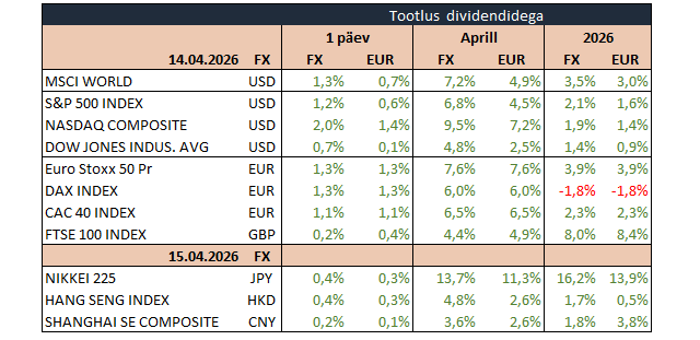 USA oodatust tagasihoidlikumaks osutunud märtsikuu tootjahinnaindeksi kasv ning tagatubades jätkuvad diplomaatide pingutused leida lähipäevil Iraani ja USA vastasseisule lahendus tõstsid eile võlakirjade hindu ning tugevdasid ka riskivarade jalgealust. S&P 500 kerkis 1,2% 6967 punktile, millega jõudis tagasi rekordtaseme lähedale, ning Nasdaq 100 rallis 1,8% 25 842 punktile. Euroopas sulgus Stoxx 600 1% plussis.
