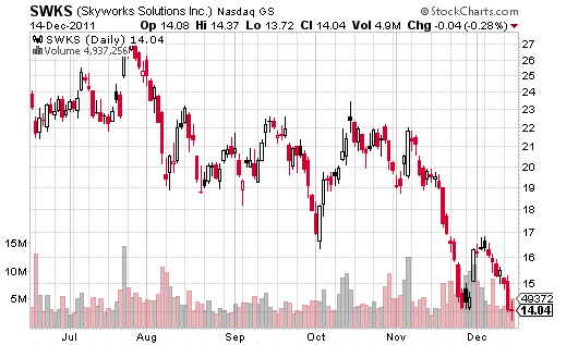 We think the market has overdone its punishment of Skyworks. The stock is off 37% in the past two months on little hard news. We think the company’s shareposition in the industry remains strong and transitions to 3G and 4G networks should boost prospects in 2012 and beyond. We are revising our estimates to reflect worst case possibilities which we think should prove conservative