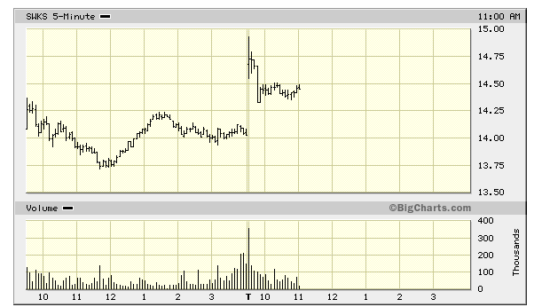 SWKS avanes täna paraku liiga kõrgelt ja peale avanemist edaspidiseks tõusuks enam jaksu ei jätkunud. Aktsia avanes $ 14,70 pealt ehk ligi 5% kõrgemalt ja tegi kohe peale avanemist kiire hüppe $ 15 taseme alla, aga tuli sealt ka kiiresti alla tagasi ja nüüd on jäänud kauplema $ 14,43 kanti, 2,7% plusspoolel.