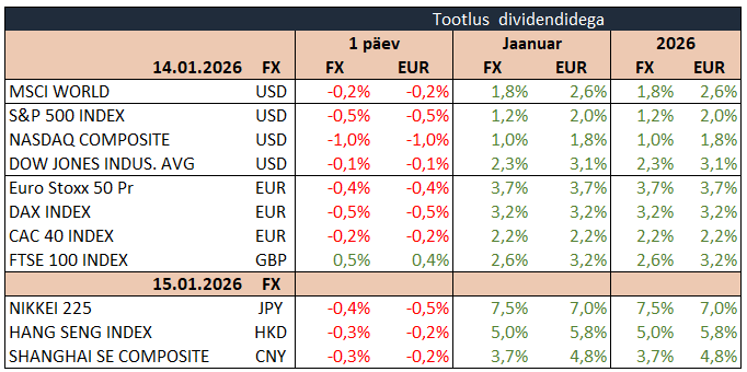 Täna avalikustatakse Ühendriikide töötleva tööstuse jaanuarikuu esmane aktiivsusnäitaja. Jälgitakse ka läinud nädalal sisse antud töötu abiraha taotlusi, mis võivad analüütikute ootuste kohaselt suureneda 208 tuhande pealt 215 tuhandele. Tulemustehooaeg jätkub täna finantssektoriga, kui aru annavad Morgan Stanley, Goldman Sachs ja Blackrock.