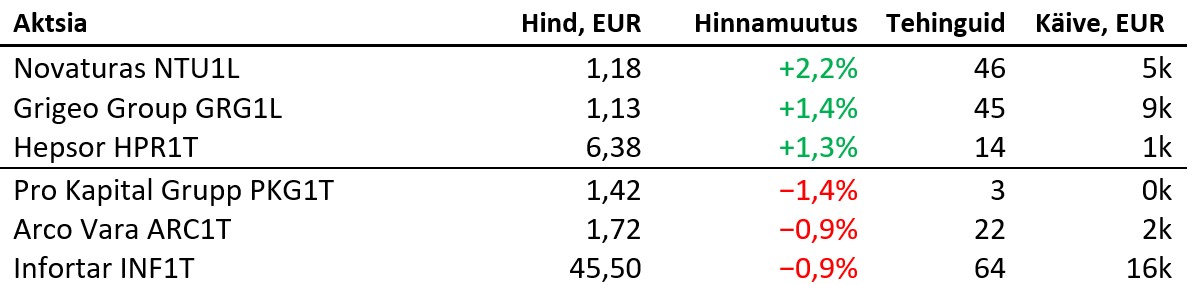 Balti põhinimekirjas tehti reedel 2735 tehingut ning käive oli 1,491 miljonit eurot, millest Tallinna börsi käive moodustas 725 tuhat eurot ning Vilniuse börsi käive 699 tuhat eurot. Tehinguid tehti vastavalt 1545 ning 1063.