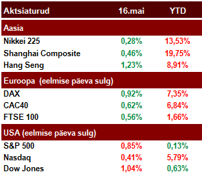 Nädalavahetusel avalikustati ka Hiina tööstustoodangu muutus, mis kasvas aprillise võrreldes aastatagusega 6% (konsensuse ootus 6,6%), märtsis oli vastav näitaja 6,8%. Riigi jaemüük oli aprillis võrreldes möödunud aastaga 10,1% kõrgem, aeglustudes märtsi 10,5% tasemelt ning jäädes allapoole ka analüütikute oodatud 10,6%.