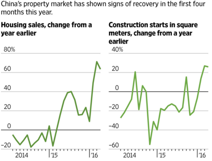 Hiina kodude müük kasvas perioodil jaanuar-aprill võrreldes aastatagusega 61%, kui nõudlust vedasid leebed laenustandardid, mille eesmärk on vähendada varusid väiksemates linnades. Investeeringud Hiina kinnisvara arendusse kerkisid 7% ning nii elu- kui ka ärikinnisvara alustatud ehituste maht kerkis aasta esimese nelja kuuga 21%.