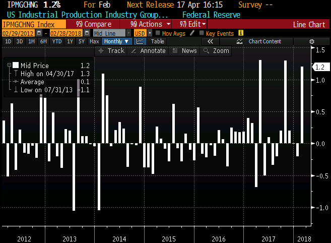 USA töötleva tööstuse toodang kasvas veebruaris 1,1% võrreldes jaanuariga, rohkem kui oodatud 0,4% aga seda pisut nõrgemaks revideeritud jaanuari baasil (-0,1% asemel -0,3%). Ka töötleva tööstuse toodang üllatas seejuures positiivselt, kerkides MoM 1,2% vs oodatud 0,5%.