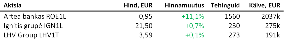 Balti põhinimekirjas tehti reedel 3547 tehingut ning käive oli 3,104 miljonit eurot, millest Tallinna börsi käive moodustas 559 tuhat eurot ning Vilniuse börsi käive 2,511 miljonit eurot. Tehinguid tehti vastavalt 1229 ning 2178.