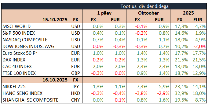 Aasia aktsiaturud kauplesid öösel positiivses meeleolus, kui Nikkei tõusis 1,3%, Kospi 2,5% ja ASX200 0,9%, kuid Hang Seng langes 0,4% ja Shangai Composite püsis muutumatuna. Brenti toornafta kallines 0,9% 62,5 dollarile, Bitcoin langes 0,7% 111 749 dollarile ning Ethereum tuli allapoole 1,8%, kaubeldes 4042 dollaril. EUR/USD tugevnes 0,1% 1,1654 dollarile ja unts kulda maksis 4224 dollarit (+0,9%).