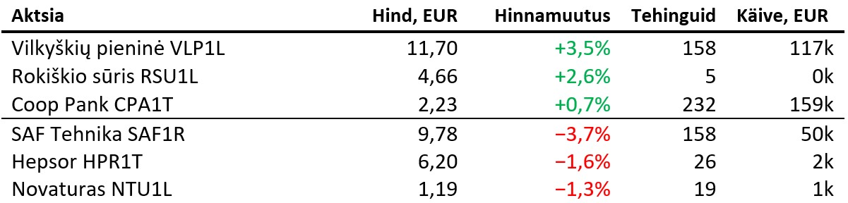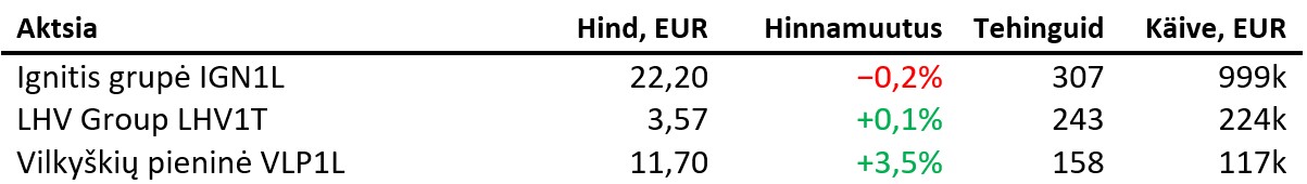 Balti põhinimekirjas tehti reedel 2887 tehingut ning käive oli 2,304 miljonit eurot, millest Tallinna börsi käive moodustas 836 tuhat eurot ning Vilniuse börsi käive 1,384 miljonit eurot. Tehinguid tehti vastavalt 1532 ning 1098.