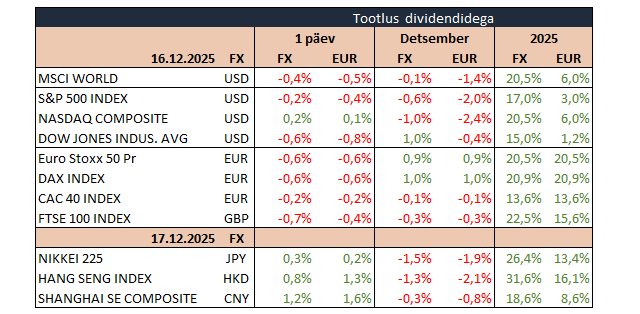 Aasia aktsiaturud liikusid öösel valdavalt kõrgemale, kosudes Jaapanis 0,3%, Hiinas 1,2%, Hongkongis 0,7% ja Lõuna-Koreas 1,4%. Brenti toornafta kallines 1,6% 59,9 dollarile, pärast seda, kui Donald Trump käskis blokeerida sanktsioonide all olevad Venezuelasse suunduvad ja sealt väljuvad naftatankerid. Bitcoin nõrgenes 1,3% 86 589 dollarile, Ethereum odavnes 0,5% 2935 dollarile ning EUR/USD langes 0,4% 1,1706 dollarile. Unts kulda maksis 4322,0 dollarit (+0,5%).