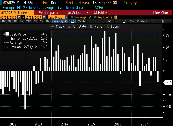 Euroopa Liidu automüük alanes mullu detsembris YoY -4,9%, mida mõjutas suurem puhkepäevade arv võrreldes 2016. aastaga.