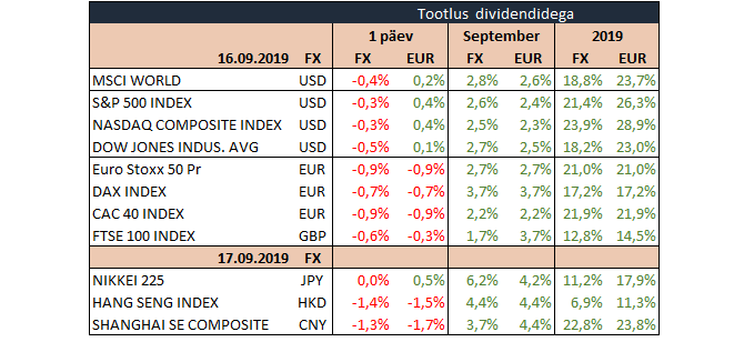 Aasia aktsiaturud kauplesid samuti valdavalt miinuspoolel eesotsas Shanaghai Composite ja Hang Seng indeksitega, mis mõlemad nõrgenesid 1,4%. Toornafta andis veidi järele pärast eilset ligi 15% hüpet, kui WTI odavnes kirjutamise hetkeks 1,4% 62,0 dollarile ja Brent -1,1% 68,3 dollarile. Ekspertide sõnul võib Saudi Araabial kuluda nädalaid või isegi kuid naftatoodangu täielikuks taastamiseks. Hiina töögrupp peaks käesoleval nädalal suunduma Ühendriikidesse, et koos sealsete kolleegidega teha ettevalmistusi kõrgemate ametnike kaubandusalaseks kohtumiseks oktoobris.