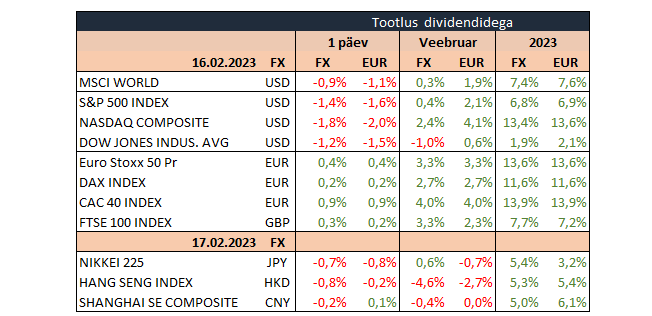Aasia aktsiaturud suundusid öösel samuti allapoole, alanedes Jaapanis 0,7%, Hiinas 0,2%, Hongkongis 0,7%, Lõuna-Koreas 1,0% ja Austraalias 0,9%. Brenti toornafta odavnes 0,9% 84,36 dollarile, Bitcoin langes 3,4% 23 711 dollarile ja Ethereum alanes 1,6% 1655 dollarile. EUR/USD nõrgenes 0,3% 1,0637 dollarile ja unts kulda maksis 1827,36 dollarit (–0,5%).