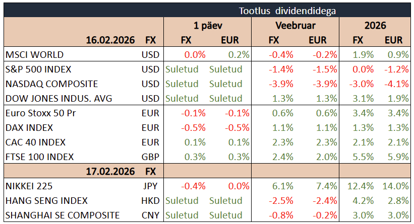 Teisipäeva hommikul viitasid USA aktsiafutuurid uuele langusele, pikendades eelmisel nädalal alanud müügisurvet. S&P 500 futuurid langesid 0,5% ja Nasdaq 100 omad 0,9%, peegeldades jätkuvaid muresid tehisintellekti kiire arengu ja selle võimaliku mõju üle traditsioonilistele tarkvaraettevõtetele. Eelmisel nädalal kaotas Dow 1,23%, S&P 500 1,39% ja Nasdaq 100 2,1%. Eriti haavatavad on olnud tarkvaraettevõtted, samas kui pooljuhtide tootjad on püsinud suhteliselt vastupidavad, sest tehisintellekti laiem kasutuselevõtt toetab nõudlust võimsamate kiipide järele. Nädala jooksul oodatakse mitme suurettevõtte kvartalitulemusi, sealhulgas Walmarti, Warner Bros. Discovery, Booking Holdingsi, Deere & Company ning Palo Alto Networksi raportid, mis võivad turule anda uue suuna.