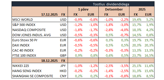 Aasia aktsiaturud kauplesid öösel samuti valdavalt miinuspoolel, alanedes Jaapanis 1%, Hongkongis 0,2%, Lõuna-Koreas 1,5%, kuid kerkides Hiinas 0,2%. Brenti toornafta kallines 0,9% 60,2 dollarile, Bitcoin tõusis 1% 86 797 dollarile ja Ethereum parandas taset 0,6% 2836 dollarile. EUR/USD püsis 1,1745 dollaril ning unts kulda maksis 4332,3 dollarit (–0,1%).