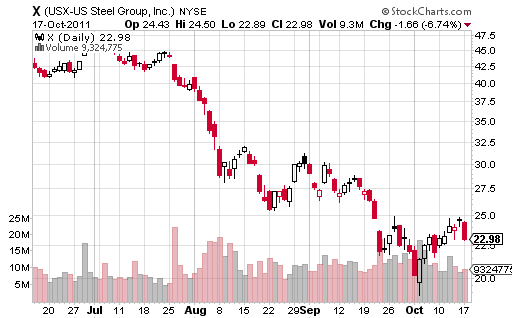 We are downgrading US Steel to Sell from Neutral with a target price of $20 (down from $30) as we believe that 2H-2011 consensus estimates for X are too high and company’s qualitative guidance for 4Q will disappoint the market, driving the stock down. Additionally, 2012 Street estimates look too optimistic and we expect these to come down over coming months. In our view, X’s current share price does not appear to fully reflect the near- term downward pressure on steel prices as supply continues to exceed demand in the US. Also, the market is not fully accounting for the continued weakness in European markets, in our view. Further, the recent downward move in global iron ore prices could diminish investors’ positive perception of US Steel’s vertical integration. And lastly, the pension headwinds next year for US Steel would be another overhang.
