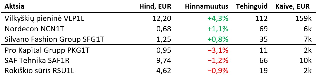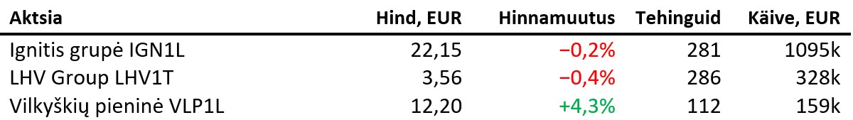 Balti põhinimekirjas tehti teisipäeval 2376 tehingut ning käive oli 2,153 miljonit eurot, millest Tallinna börsi käive moodustas 673 tuhat eurot ning Vilniuse börsi käive 1,455 miljonit eurot. Tehinguid tehti vastavalt 1170 ning 1050.