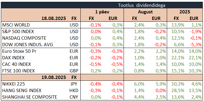 Aasia aktsiaturud kauplesid öösel miinuspoolel, langedes Austraalias 0,7%, Jaapanis 0,4%, Hiinas 0,2%, Hongkongis 0,3% ja Lõuna-Koreas 1,0%. Brenti toornafta odavnes 0,5% 65,3 dollarile, Bitcoin odavnes 0,2% 115 061 dollarile ja Ethereum langes 0,3% 4245 dollarile. EUR/USD tugevnes 0,1% 1,1664 dollarile ja unts kulda maksis 3335 dollarit (+0,1%).