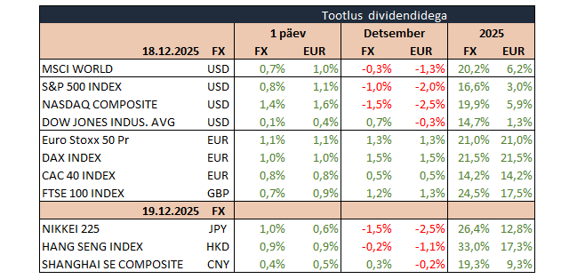Aasia sessioonil tõsis Jaapani keskpank intressimäära 25 baaspunkti võrra 0,75% peale, mis on kõrgeim tase viimase 30 aasta jooksul ja viitas võimalusele, et seda võidakse veelgi kergitada, kuna inflatsioon on viimaks jõudmas majandusse pärast varade mulli lõhkemist 90ndatel. Jaapani aktsiaturgu see ei seganud ning Nikkei parandas taset 1%. Plussis kauplesid ka Hiina (0,4%), Hongkong (0,9%) ja Lõuna-Korea (0,7%). Brenti toornafta odavnes 0,3% 59,6 dollarile, Bitcoin kerkis 2,6% 87 827 dollarile ning Ethereum kosus 4,5% 2953 dollarile. EUR/USD odavnes 0,1% 1,1713 dollarile ning unts kulda maksis 4328 dollarit (-0,1%).