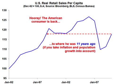 FinancialArmageddon blogis jäi silma üks võrdlemisi sarkastiline graafik teemal, mida ma mõned nädalad tagasi LHV foorumis lahkasin – ülepaisutatud USA detsembrikuu jaemüük. Sisuliselt näitab allolev graafik seda, et kui võtta arvesse inflatsioonimäära ja USA rahvastiku kasvu, siis möödunud aasta “tugeva” jõuluhooaja järel on USA jaemüük samal tasemel, kui 11 aastat tagasi.