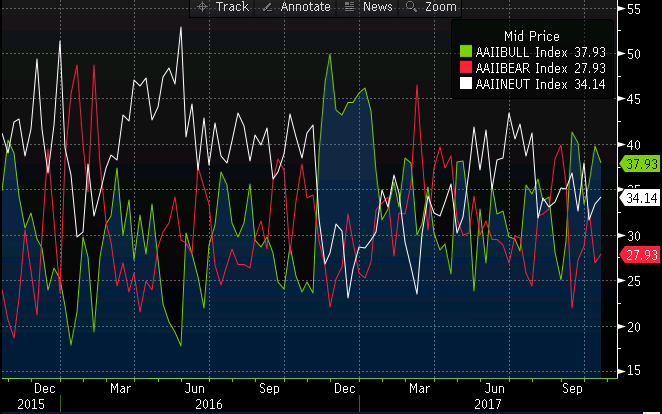 19. oktoobri seisuga on pullide osakaal USA väikeinvestorite seas viimase nädala jooksul alanenud 39,8% pealt 37,9%le, karude osakaal kerkinud 26,9% pealt 27,9%le ning järgmise kuue kuu osas neutraalse hoiakuga investorite osakaal tõusnud 33,3% pealt 34,1%le. Kokkuvõttes on muutused marginaalsed, peegeldavad optimislikku sentimenti, kuid mitte eufoorilist.