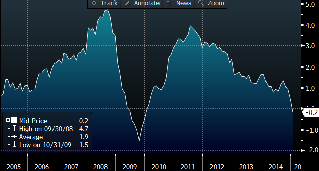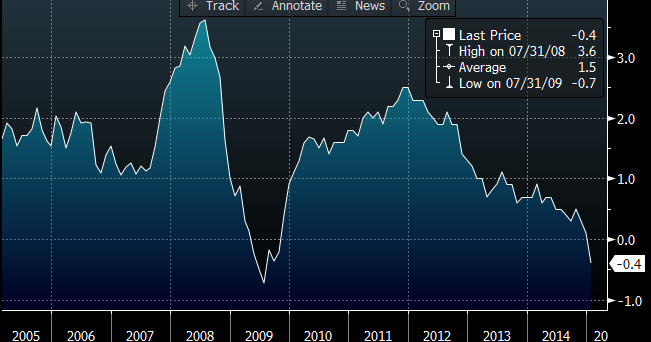 Prantsusmaa deflatsiooniks kujunes jaanuaris -0,4% (detsembris +0,1%), osutudes oodatust veidi sügavamaks (-0,3%)