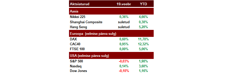 Ühendriikides jäid emotsioonid eile suhteliselt vaoshoituks, ka isegi pärast FOMC jaanuari istungi protokolli avaldamist, mis siiski suutis S&P 500 indeksi päeva lõpuks kergest miinusest nulli vedada. Euroopas seevastu jätkasid investorite emotsioonide juhtimist Kreekaga seotud pealkirjad, mis pealispinnal hoiavad üleval lootust, et mingisugune lahendus suudetakse lähipäevil leida. Stoxx 600 indeks kosus 0,9%.