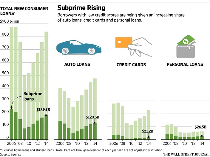 Almost four of every 10 loans for autos, credit cards and personal borrowing in the U.S. went to subprime customers during the first 11 months of 2014, according to data compiled for The Wall Street Journal by credit-reporting firm Equifax.That amounted to more than 50 million consumer loans and cards totaling more than $189 billion, the highest levels since 2007, when subprime loans represented 41% of consumer lending outside of home mortgages.
