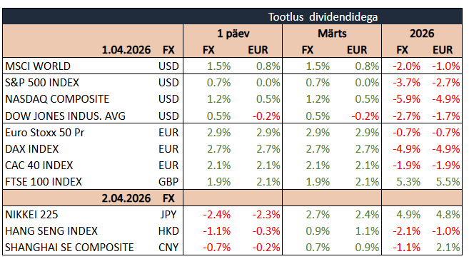 USA aktsiaturud lõpetasid kolmapäeva tõusuga, jätkates kuu alguses alanud rallit, kui kasvav optimism Lähis-Ida konflikti võimaliku lõpu osas parandas meeleolu. S&P 500 kerkis 0,9%, Nasdaq 100 1,3% ja Dow Jones 0,6%. Turu sentimenti toetas president Trumpi viide, et Iraan on taotlenud relvarahu ning USA võib lähinädalatel piirkonnast taanduda, kui Hormuzi väin muutub taas turvaliseks ja toimivaks. See vähendas geopoliitilist riskipreemiat energiaturul ning tõi kaasa naftahinna languse.