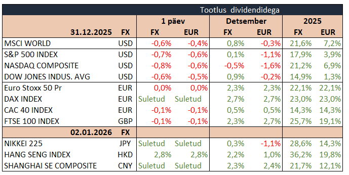 2025. aastat iseloomustasid samas ka mitmed riskitegurid, nagu tariifidest tingitud volatiilsus, geopoliitilised pinged, aktsiate kõrged hinnatasemed ning pidevalt muutuvad ootused USA rahapoliitika suhtes. Föderaalreservi protokollid tõid esile selged erimeelsused intressikärbete ajastuse ja tempo osas 2026. aastal, kuid säilitasid siiski üldise leevendava hoiaku, mis toetab turuootusi ka uue aasta alguses.
