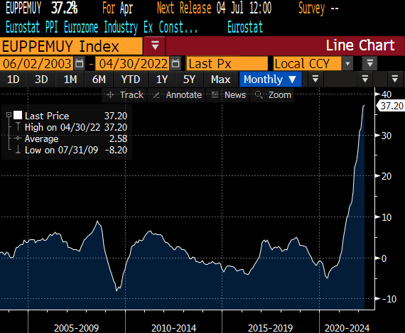 Euroala tootjahinnaindeksi kasv kiirenes mais 37,2%ni....siiski vähem kui oodatud 38,2% :)