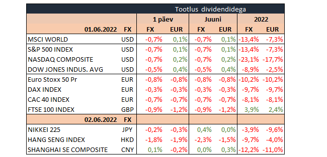 Aasia aktsiaturud kauplesid öösel valdavalt miinuspoolel. Nikkei langes 0,7%, Hang Seng alanes 1,7%, Kospi 1,1% ja S&P/ASX200 tuli 1,0% allapoole. Shanghai Composite oli üks vähestest, mis suutis taset 0,1% võrra parandada. Brenti toornafta hind jätkas langust 2% võrra 113,9 dollarile pärast FT artiklit, mille kohaselt olevat Saudi Araabia valmis Venemaa pakkumise asendamiseks vajadusel oma naftatootmist suurendama. Bitcoin kauples 29 754 dollaril (+0,4%) ja Ethereum liikus 1,2% kõrgemale 1813 dollarile. Kulla untsi hind püsis eilsel sulgumistasemel 1846 dollaril.