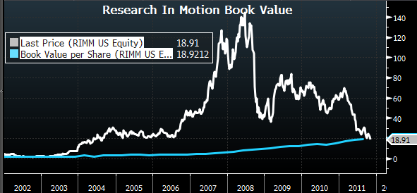 RIMM-i aktsiahind vs raamatupidamisväärtus aktsia kohta: