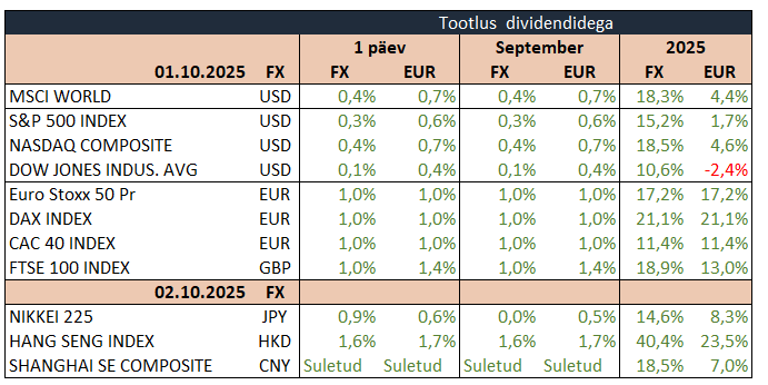 Makropoolel pakkus üllatavalt negatiivset signaali ADP raport, mis näitas, et erasektoris kadus septembris 32 000 töökohta, mis on suurim langus alates 2020. aastast. Samuti jätkus USA töötlev tööstus langust seitsmendat kuud järjest.