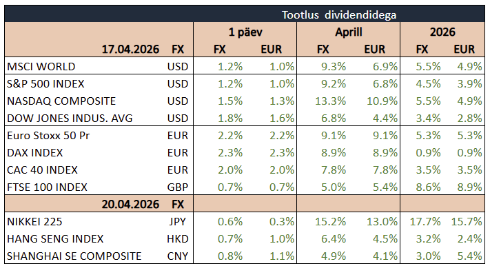 USA aktsiaturud lõpetasid reede tugevas tõusus, kerkides uutele rekordtasemetele pärast seda, kui Iraan teatas Hormuzi väina avamisest rahvusvahelisele laevaliiklusele. S&P 500 tõusis 1,2%, Nasdaq 100 1,5% ja Dow Jones 1,9%, kuna energiaturu pingete leevenemine parandas märkimisväärselt investorite meeleolu. Nafta hinnad langesid järsult, kuna pinged taandusid ning ootused energiatarne normaliseerumisele tugevnesid.