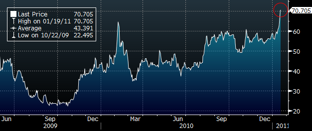 Täna munitsipaalvõlakirjade CDS lepinguid vaadates jäi silma hoopis USA 10-aastase võlakirja CDS (eurodes), mis täna ca viimase 2 aasta rekordi püstitas. Viimati oli CDS 70.7 punkti tasemel 2009. aasta märtsi keskel. Võrdluseks võib tuua, et siis kauples S&P 500 indeks ca 780 punkti tasemel.