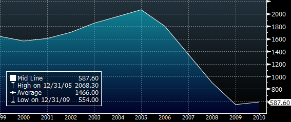 Kui nüüd Vallo poolt öeldule omaltpoolt lisada, siis Morgan Stanley avaldas eile USA kinnisvarasektori kohta vägagi negatiivse raporti. Allpool kujutatud graafikul on kujutatud uute majade aastane ehitustempo 2000. aastast saati, mis on ületanud oluliselt 1.25 miljoni piiri, mida MSi analüütikud peavad nii-öelda jätkusuutlikuks (ehk kui kinnisvara ehitataks sellise tempoga, siis ei oleks turul varusid ega puudujääke). Nagu Vallo mainis, siis praeguse müügitempo juures on varu ca 8.1 jagu, mis MSi hinnangul püsib veel ca 2.5 aastaks.