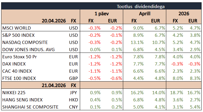 USA aktsiaturud lõpetasid esmaspäeva kerges languses, kui geopoliitilised pinged tõusid taas fookusesse. S&P 500 taandus 0,2%, Nasdaq 100 0,3% ning Dow Jones püsis sisuliselt muutumatuna, lõpetades mitmepäevase tõususeeria. Turge survestasid uudised, et Iraan peab Hormuzi väina jätkuvalt suletuks ning president Trump ei pruugi relvarahu pikendada, kui kokkulepet ei saavutata.